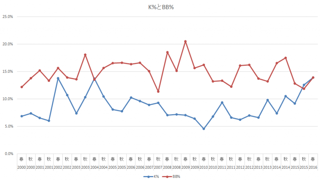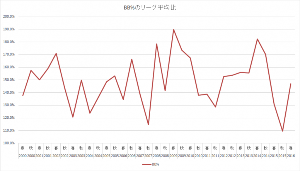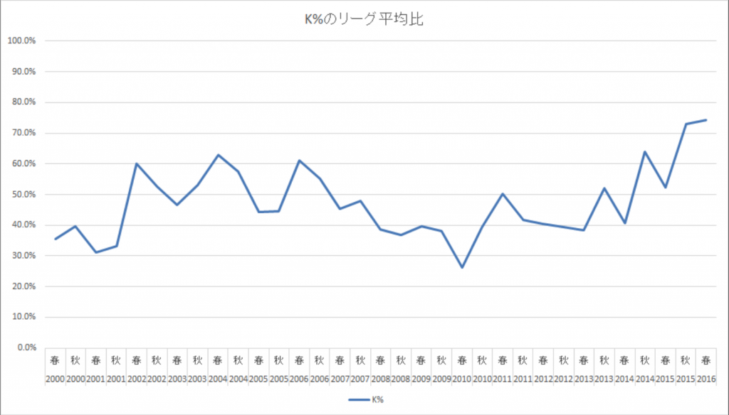 特に近年の数字には眼を見張るものがある。平均比ではない実際の数値で見るとK%とBB%の差は詰まっており、K%の方が高くなってもいる。平均比の数値でみても、16春のBB%は少し上昇してしまっているが、それでもかなり優秀な数値が残されている。やはり、近年の失点の減少には投手力の向上があると言えるだろう。