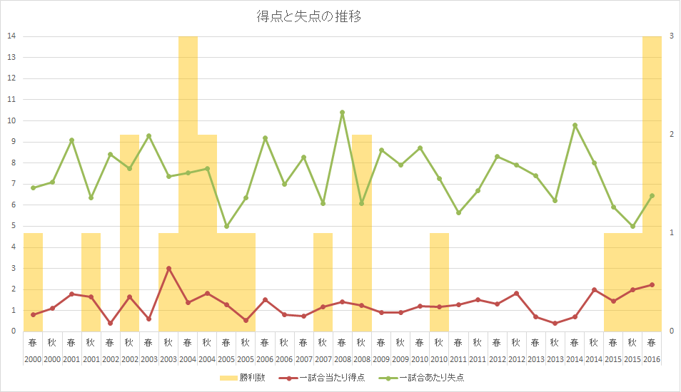 次に、東大の成績の推移を見てみる。次の図は、東大野球部の一試合あたりの得点と失点のリーグごとの移り変わりを示している(左の軸)。黄色い棒グラフは東大の勝利数を示す(右の軸)。前述の通り、得点・失点を増やす・減らすということは野球において非常に重要なことで、勝利のための小目標と言って良い。この推移を追うことで総合的な攻撃力と守備力を追うことが出来る。