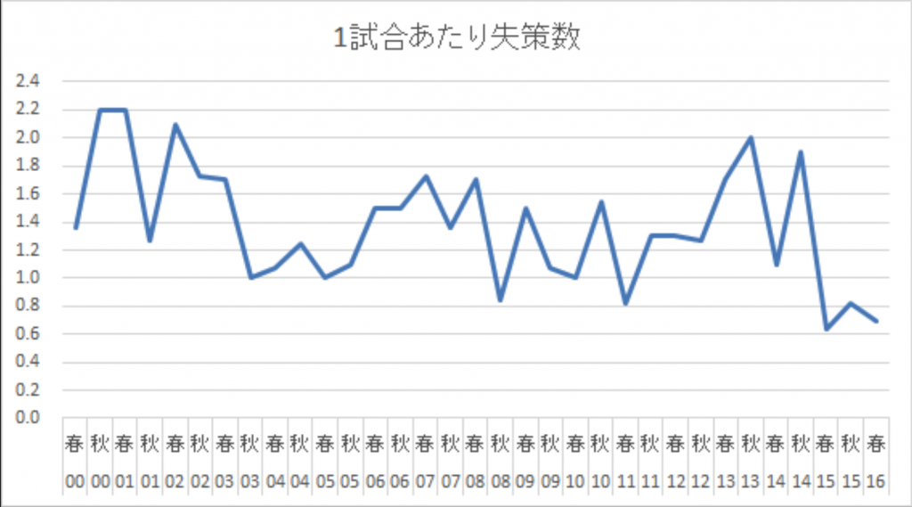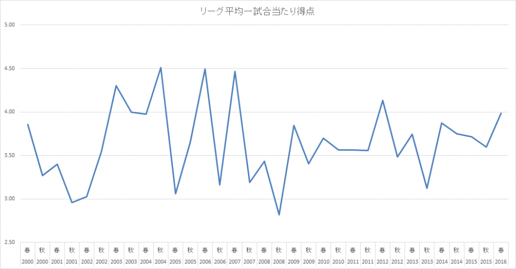 参考までに、以下にリーグ全体での一試合あたりに片方のチームに入る得点(裏返せば1試合あたりのチームの失点)の推移を示した。これは、リーグ全体の得点の入りやすさを示している。