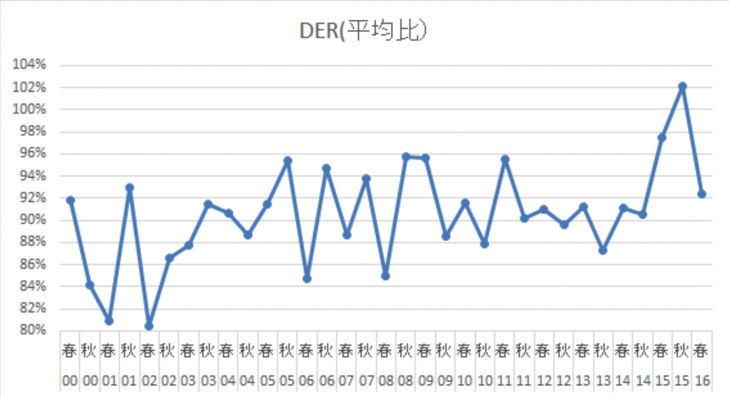 同様に、東大のDERの推移を示す。前述したとおり大まかな守備力を見ることが出来る。更に、守備力そのものではないが、守備の一要素として確実性を見るために1試合あたりの失策数も示す。