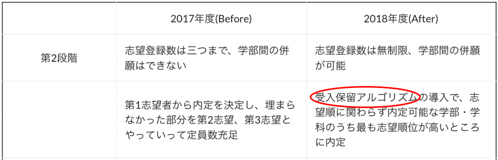 | 第1志望者から内定を決定し、埋まらなかった部分を第2志望、第3志望とやっていって定員数充足 | 受入保留アルゴリズムの導入で、志望順に関わらず内定可能な学部・学科のうち最も志望順位が高いところに内定 | |