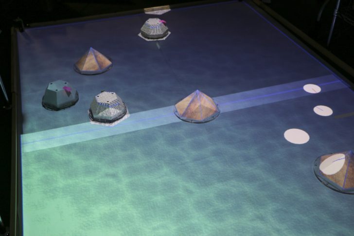 福島さん「これはMRPM、マルチロボットアンドプロジェクションマッピングという対戦ゲームです。お客さんにロボットを操作していただき、AIで動いているロボットと陣取り合戦のような対戦ゲームをしていただきます。フィールドやロボットの模様を上に設置したプロジェクターからプロジェクションマッピングしています。」