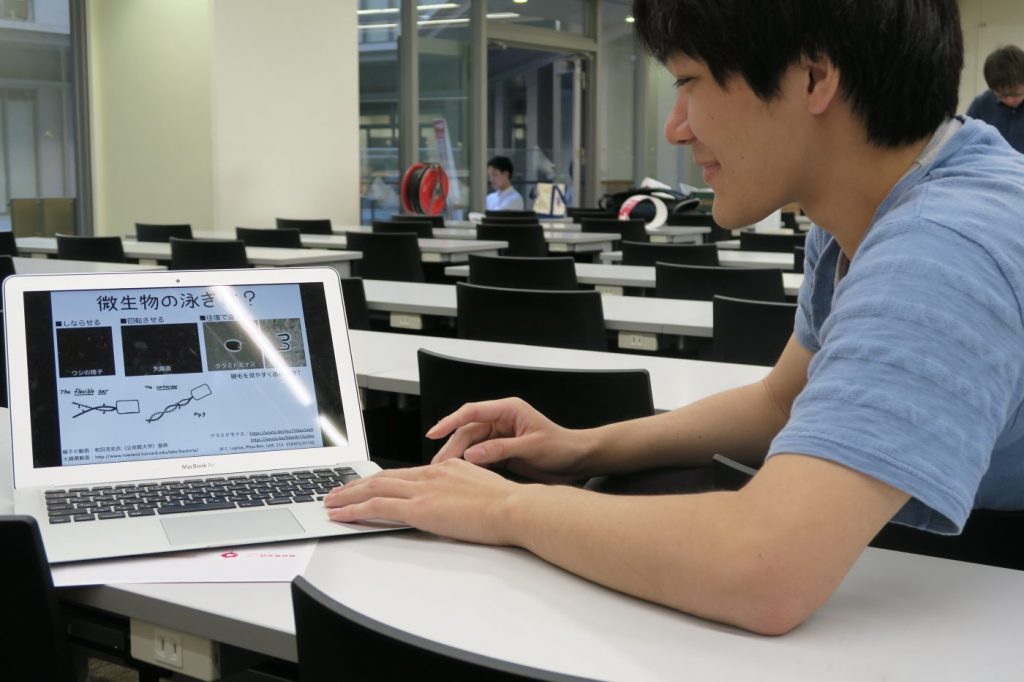 ホタテはハチミツの中を泳げるのか? 微生物たちは水中をどのように泳ぐのか? ドロドロの液体の世界やミクロの世界では、我々の直感が通用しません。この2つが流体力学の「ホタテ貝定理」で繋がります。かわいい微生物の泳ぎを、物理の視点で一緒に眺めましょう! (西口 大貴さん 理学系研究科 物理学専攻 博士課程)