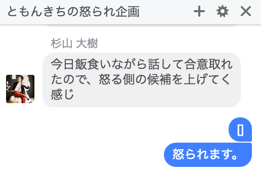 数日後、不思議なことに、Messengerに「ともんきちの怒られ企画」というグループができていました。インタビューのついでに僕を叱ってくれる人を募集するグループらしいです。