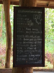 一休みした後は、訓練着に着替えていよいよmahoutの訓練です。屋外の教室のようなところへ行き、象を操るための象語の練習。小学校の教室のように、「PAI PAI(進め)」 「HAO HAO(止まれ)」などと大きな声で暗唱しました。