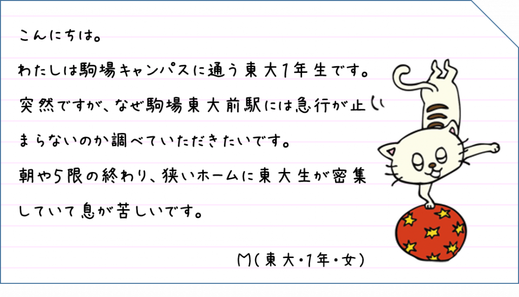僕「もしもし、私東大UmeeTという団体でライターをしている男子校の化身(もちろん本名で言いました)と申します。先日ある東大に通う生徒から京王井の頭線の急行がなぜ駒場東大前駅に停まらないのかという不満の声を聞きまして、調べたところ多くの学生が同様の不満を抱いていることがわかりました。急行を駒場東大前駅に停車出来ない理由を教えて頂くことは可能でしょうか?」
