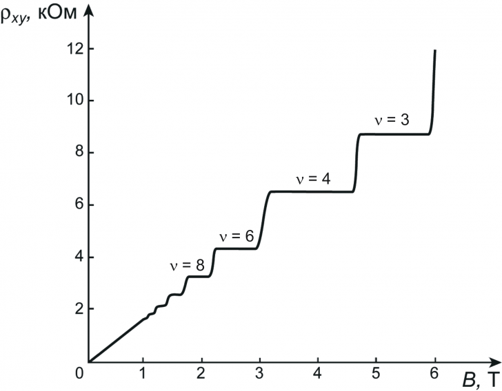 物質中でのトポロジーが巨視的に顔を出す顕著な例として量子ホール効果が知られています。この効果は、二次元平面中に閉じ込めた電子の集団を低温に冷やし強磁場をかけることで、ホール抵抗の値がh/e2 ≒25.81280745 kΩを整数で割ったものになる、というものです。1980年にvon Klitzingらによって実験的に発見され、1985年にその発見に対してノーベル物理学賞が与えられています。eは電子の電荷、hはプランク定数であり物理学の基本定数ですから、用いる物質や試料の形状に依存せず、多少の不純物が混入した程度では値が変わらない、という著しい性質を表しています。ホール抵抗はy方向に電圧Vyをかけ、x方向の電流Ixを図った時のVy/Ixで表されるので、測定は(低温、強磁場であることを除けば)簡単です。このようにシンプルな測定で、10桁もの精度で普遍的な値の抵抗値が現れる、ということで、現在では電気抵抗値の国際標準として用いられています。また、この現象はプランク定数が現れることから分かる通り量子力学的な現象なのですが、巨視的な電流の測定によって量子力学の帰結を見ることができるのも面白いですね。