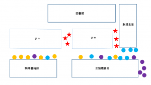 A 基本的には早い者順です。上で書いたように、多少サークルによって使う場所の傾向は変わりませんが、場所は決められているわけではないので自由に使うことができます。