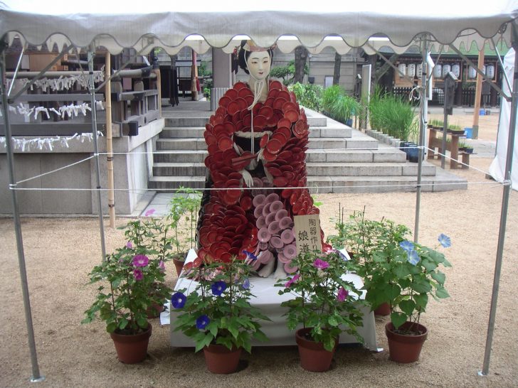 ※大阪せともの祭り: 江戸時代初期から受け継がれて来た、300年以上の歴史と伝統のある行事。坐摩神社(いかすり神社)、通称「ざまじんじゃ」の境内にある火防陶器神社に陶磁器皿作り人形を奉納し、茶碗を供養する盛大な夏祭りを行い、今日まで継承されて来た。