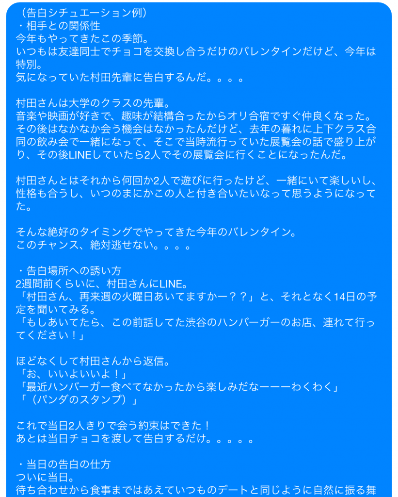 告白シチュエーション:「もしバレンタインに告白するなら」というテーマで彼女たちが事前に考えてきた文章。
