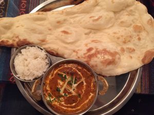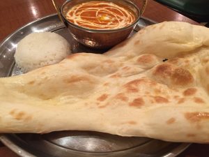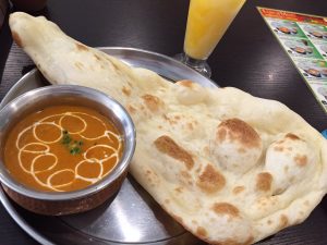 ナンはバター少なめのあっさりした味で、カレーは舌に残るまろやかさで美味しい。