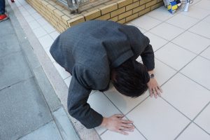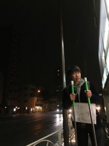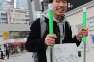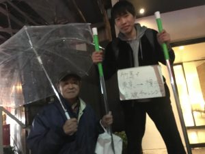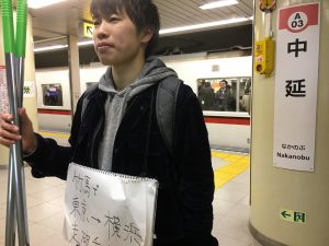 また、浜松町周辺で通りすがりのおじいちゃんに「頑張ってるね、写真撮ってよ」と言われて一緒に写真撮ったり話したりしたのですが、そのときに「こういうのはカンパ袋背負いながらやったほうがいいよ」と言われました。