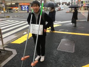 竹馬で歩いている途中、通行人の方からはもちろん何事かと不審な目を向けられることも多かったのですが、意外と応援してくれる方が多くてびっくりしました。と同時に、その声援にかなり助けられました。