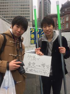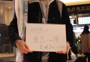 「そうだ!竹馬で東京駅から横浜駅まで歩ききってみせよう。竹馬には小学校の校庭は狭すぎる」