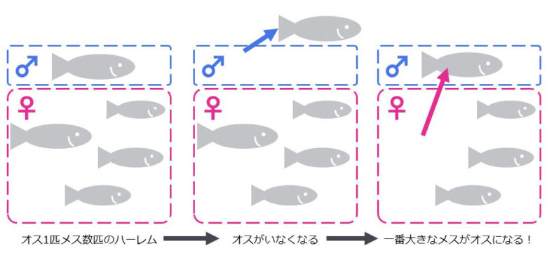 そのオスが何かの拍子にいなくなると、メスだった個体がオスに変わります[1]。一番大きな1匹だけがオスになり、残りはメスのままです。