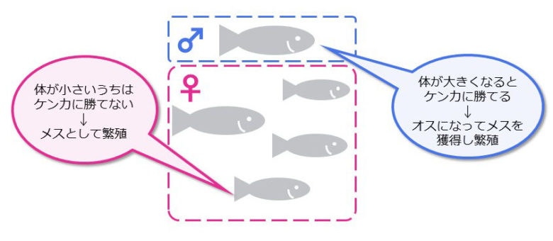 「小さいうちはメスでいて、他のオスにも勝てる大きさに育ったらオスに性転換」ができれば、生涯でよりたくさんの子孫を残せるのです。