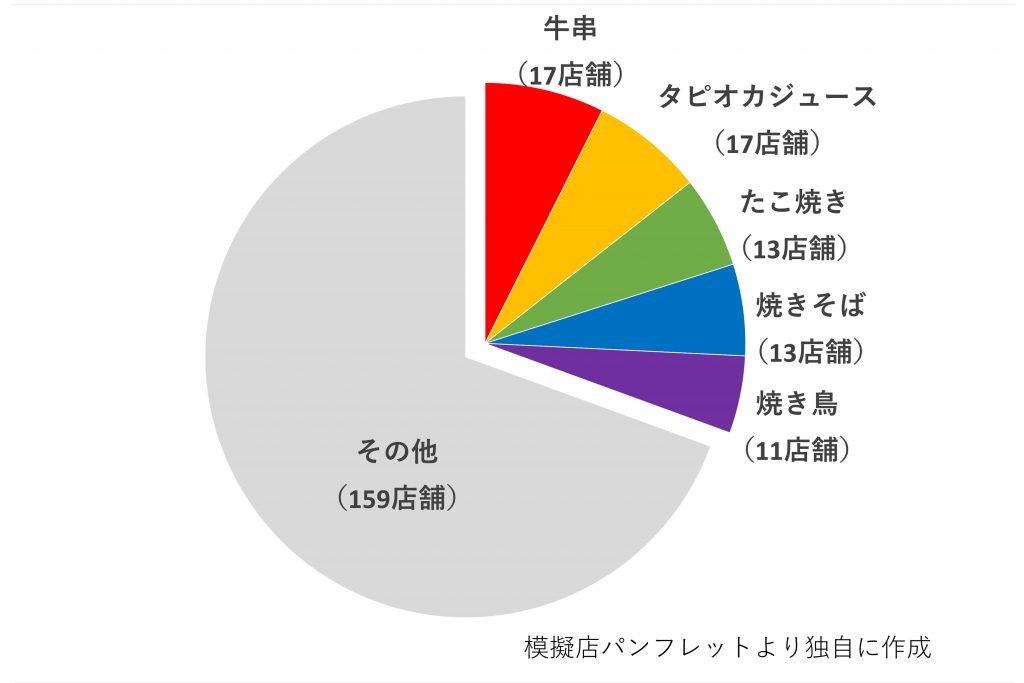 入学してすぐ、オリ合宿で上クラに「一年生はクラスで出店するもん」と言われ、なんかよくわからないけど出店するケースで、全体230店舗中の91店舗を占めています。