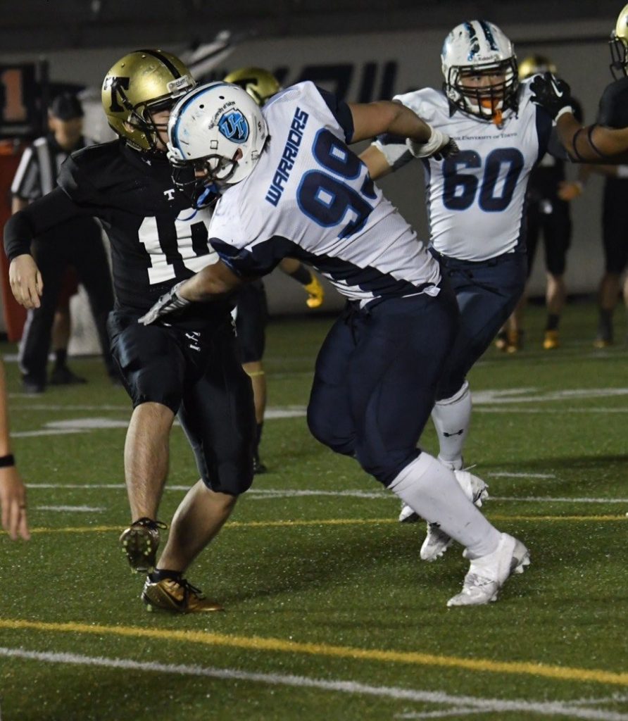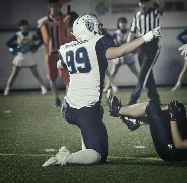 ポジションは、最も体のぶつかり合いが激しいが、瞬発力が求められるDL(Defense Line…ディフェンスの切り込み隊長。ディフェンスの最前線で奮闘する、通常4人からなるユニット。爆発的なスピードとパワーで、敵に襲い掛かる。)なら、足の速さ(50mは 6.1秒!)を生かせると思いDLを選びました。