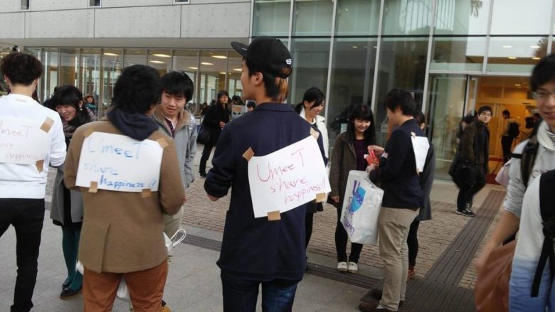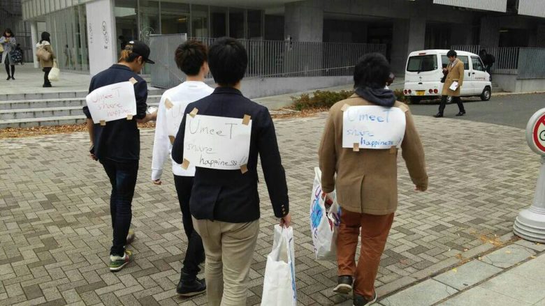 しかし「UmeeT Share happiness !」と書いた紙を背中に貼り付け、大量のポッキーを抱えた異形の集団から、ポッキーを受け取ってくれる奇特な人などいるのかな・・・?