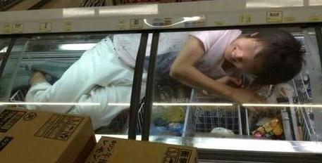 「そろそろ寝よ( ̄▽ ̄)/今日の1枚♪( ´▽`)/てっちゃんは先出て行ったからおらんけど(笑)」(店内のアイス用冷凍庫に頭を突っ込む画像)