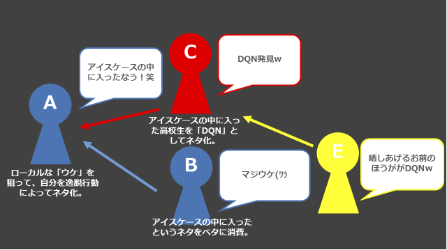 しかし,例えば,高校生がアイスケースの中に入っている画像が,ソーシャルメディアを介して,ネタ・コードを共有していない人びと,つまり,それをネタとしては見ない人びとに届いてしまったら,どうなるでしょうか.