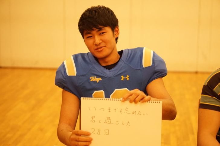 28日っていうのは、冬にあるアメフト部の長期オフの日数です。アメフト部って基本的に夜に練習があって、僕はバイトもしているので、彼女と会える時間が短いんですよね。その分この冬の長期オフに彼女と過ごした時間がすごく幸せだったので、それを表してみました。