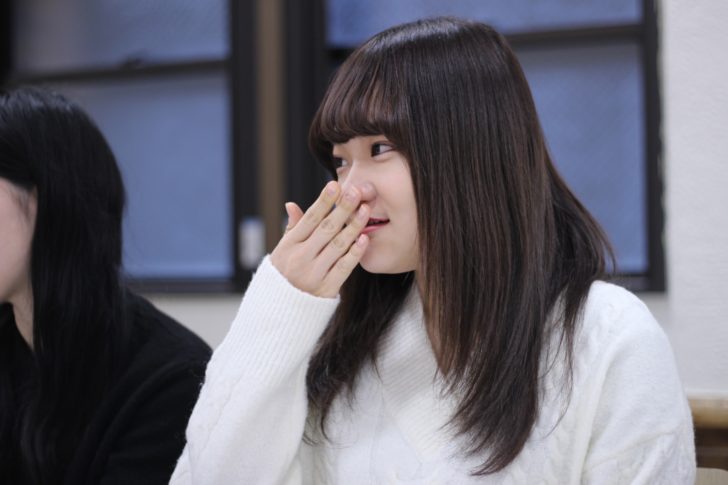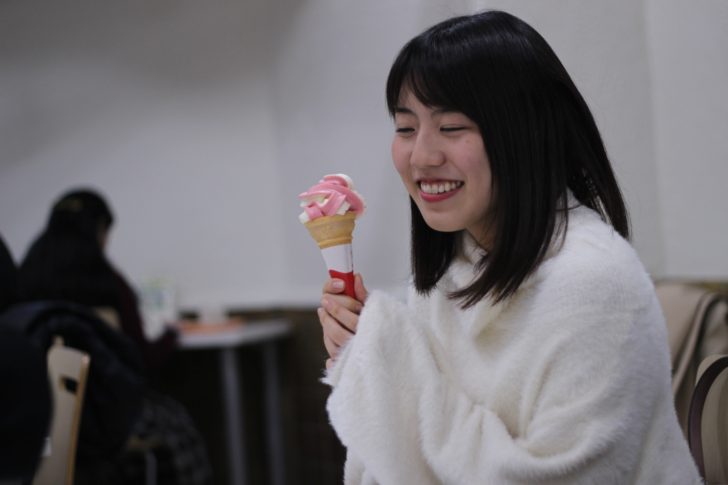 ちあき「同じく工学部3年のちあきです。出身は埼玉です。ハロプロ(ハロー!プロジェクト)が大好きで、一番好きなのはアンジュルムです。いや、でもハロプロはみんな好き。アンジュルム以外だと、モーニング娘。が最近アルバムを出して、つんくさんがアルバム曲を全部書いてるんですよ。それがめっちゃいいです。実力的にはJuice=Juiceっていうグループもいいと思います。いや、でもアンジュルムが一番だけど。私はもともとは、Buono!の嗣永桃子さんから入ったんですよ。TVで『初恋サイダー』を歌ってるのを見て、かっこいい!って思って。はい、もうオタクに収納、って感じでした。しゅ〜って(笑)」