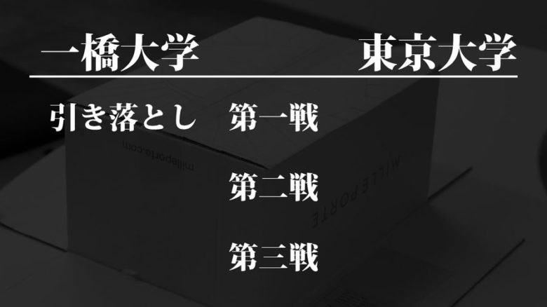 まあ、「東大vs一橋(東大ファン)」という対決の構図は一橋生として恥ずかしいし対決も盛り上がらないので、ここでは「東大vs一橋(便宜上東大のライバル)」ということにさせてください。便宜上。