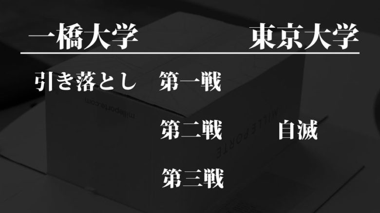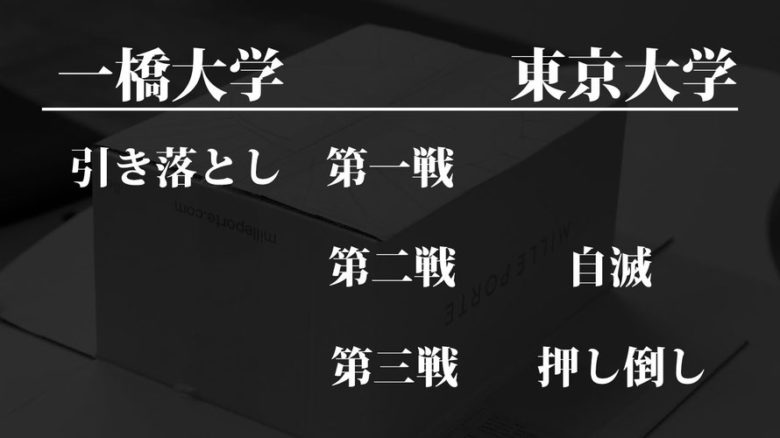 いやー、見事な引き落としでしたね。東大の学生証が一橋の学生証に跪く歴史的瞬間です。途中までは非常に拮抗した勝負でしたが、最後に東大がバランスを崩してしまいました。