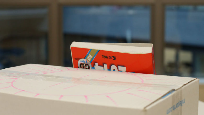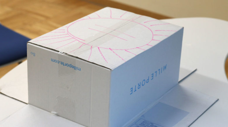 こちらが今回の対決で使用するバトルフィールド。家に落ちていたダンボールに、アバンギャルドな土俵風の装飾を施しました。ハイセンス!