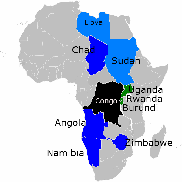 ▲第二次コンゴ紛争は内戦という名の国際紛争だった。関係国は図の通り。Quaraより