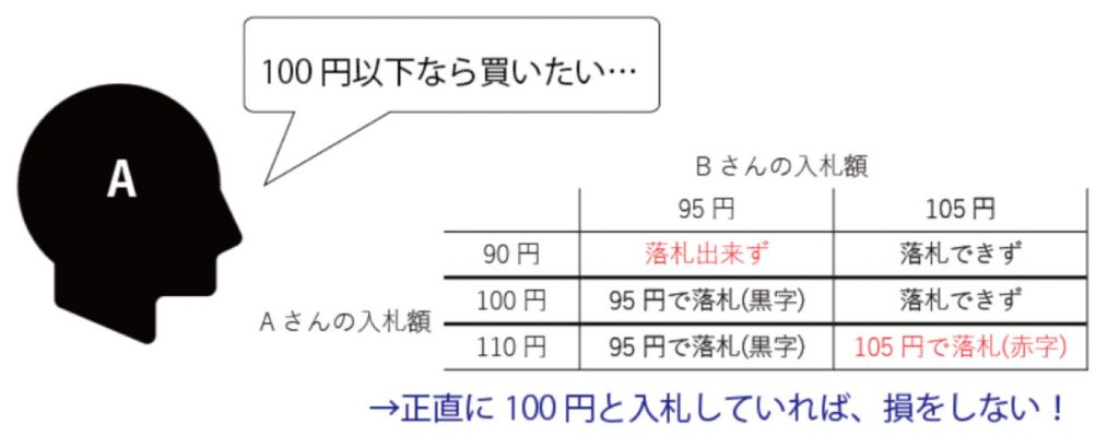 実はこれ、自分が本当に欲しいと思っている値段を正直に言うと得をする制度になっているんです。AさんとBさんの二人が二位価格オークションに参加する例を考えてみましょう。Aさんは100円以下なら買いたいと思っています。
