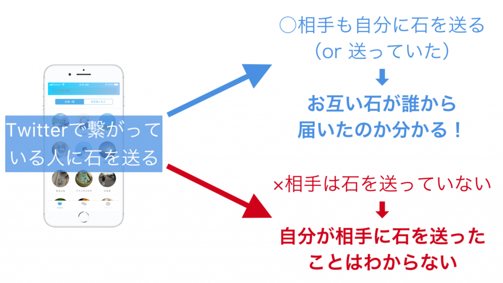 Twitterでフォローしている人から、石(友達申請)を送りたい相手を選ぶと、相手も自分に石を送ってくれていた場合、マッチしてトークを開始することができます。