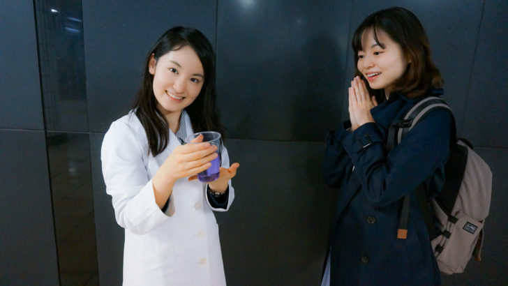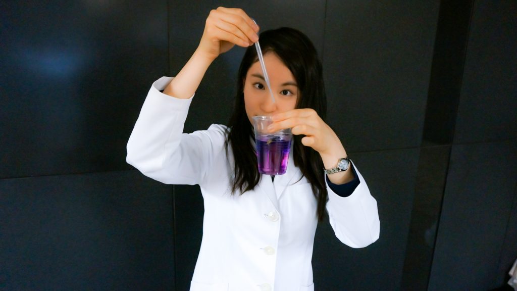 白衣を着た女性「ピンクになったのがわかりますか?マロウブルーのもつ青色色素「アントシアニン」が,レモンに含まれる酸っぱい成分「クエン酸」と反応して、色が変わっているんですよ!」