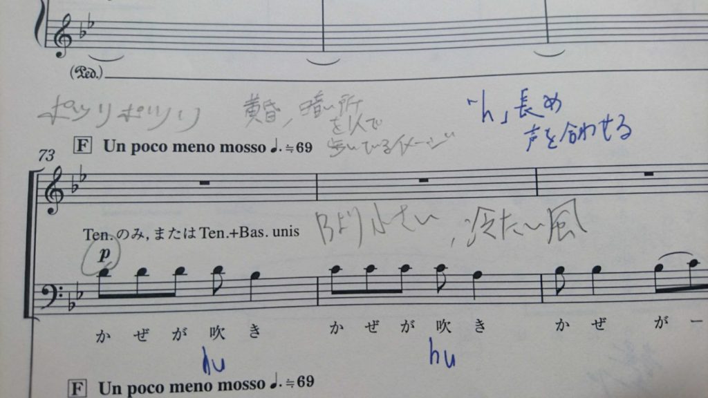 例えば、文学部志望の2年生が指揮を降る時は、詩の解釈を合唱する前に軽く話してくれたり、また、自分の得意な語学の知識を活かして、イタリア語の日本語訳がどのように対応しているのかを考えてくれたり、ある先輩団員はイントネーションについての知識を活かして、この歌詞の発音はこうした方が自然ではないかと教えてくれたり、と表現の手がかりをくれます。