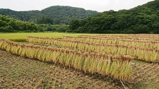 おだかけ:収穫した稲を天日干しにするために、木や竹で組んだ土台に稲の束をかけていく作業のこと。