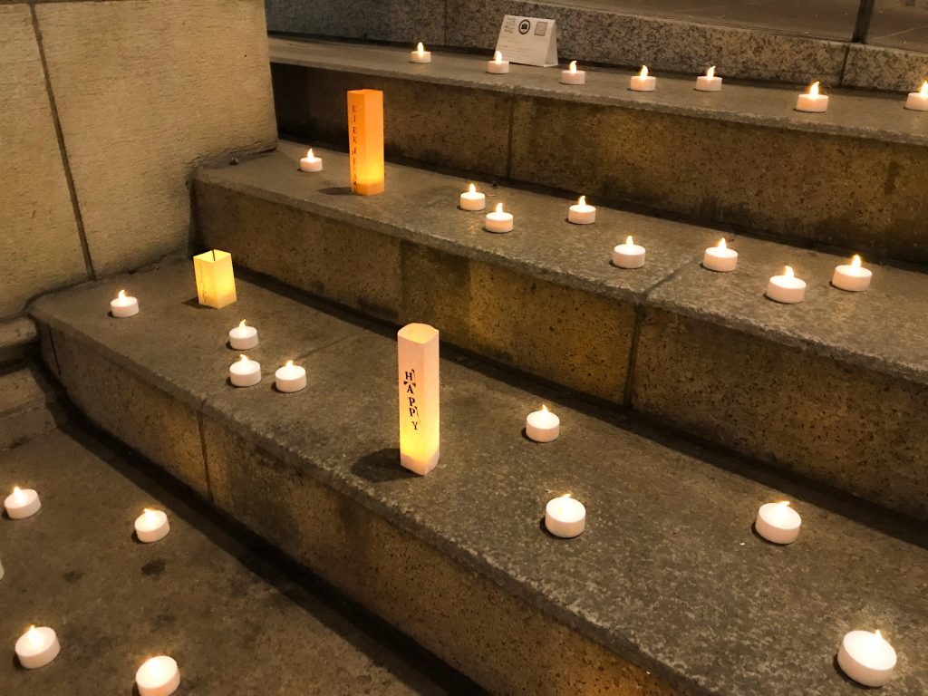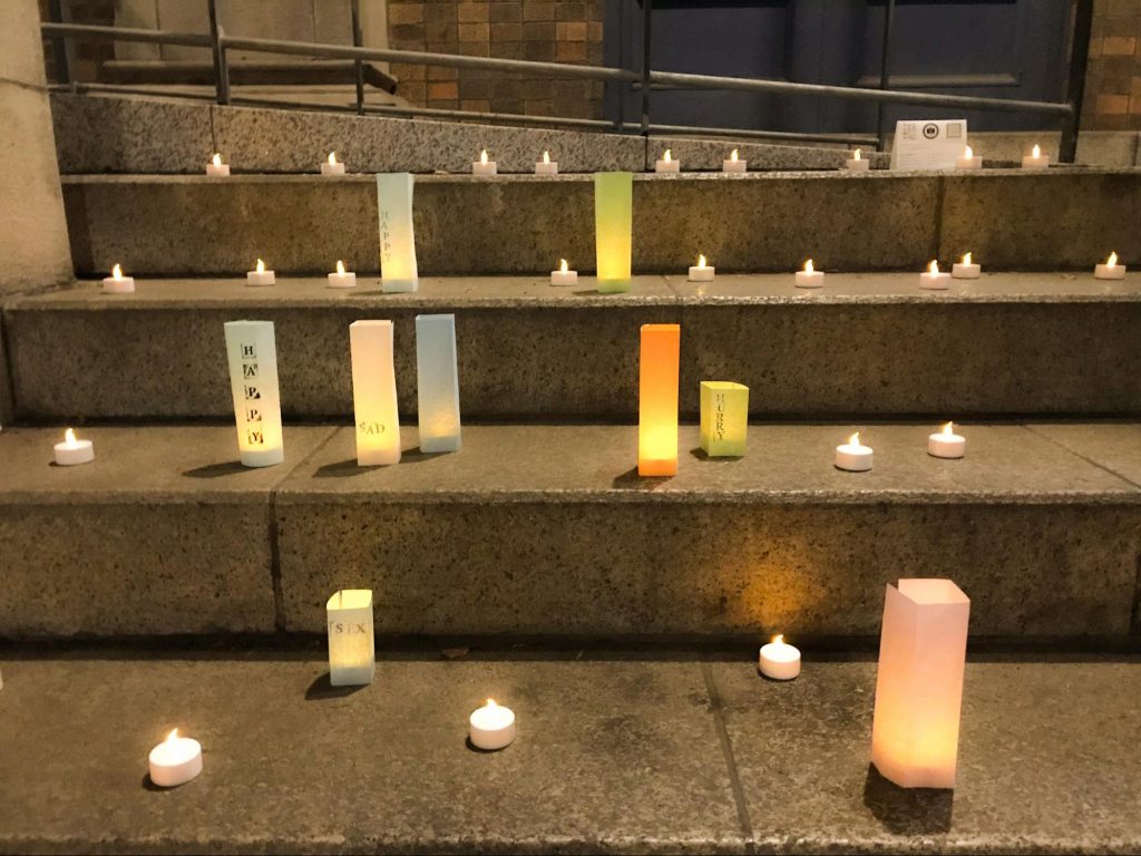 「きもちをともそう」は、アーケード内にキャンドルライトを並べて、通りすがりの東大生にそのときの気持ちにあった色紙をかぶせて灯籠にしてもらう、というイベントです。アルファベットのスタンプを用意して、色紙に好きな言葉を書いてもらいました。