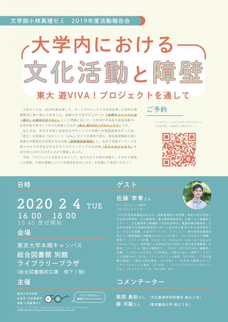 活動報告会では、1年間の活動報告に加えて、ゲストにアーツカウンシル東京の佐藤李青さん、コメンテーターに大学院生の風間勇助さんと韓河羅さんをお呼びして、大学内でプロジェクトを行うことについてのディスカッションを行います。