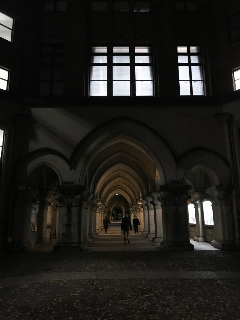 ご存知の方も多いと思いますが、法文の建物といえばあの荘厳なアーケードです。内田祥三氏の設計で、有形文化財にも登録されています。