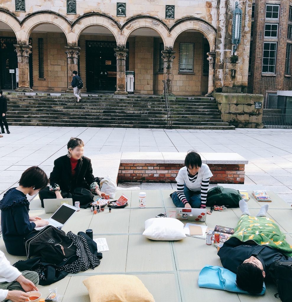 この企画の目的は、所属の違う学生の交流を促すこと。学生たちがそれぞれの学部で散り散りに過ごしている本郷キャンパスにおいて、どの学生にも平等に開かれた場所である総合図書館を舞台としました。いつもは学生たちが思い思いに過ごしている図書館前広場で、強制的でない方法で学生たちの交流を促すにはどんな方法があるだろう……。議論の末、広場の一番広いベンチの上に畳を敷いてみることになりました。