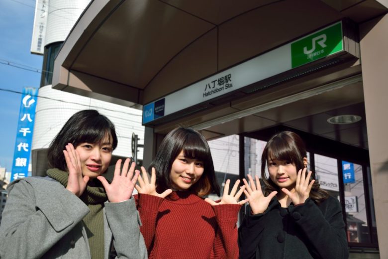 お菓子作りに挑戦するのはこの3人! キャンパスから少し離れた八丁堀駅に集合です。