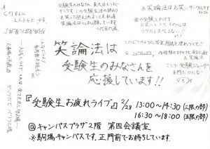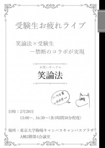 笑論法はさらなるコラボを果たします!それは… “受験生“です! 2/28に「受験生お疲れライブ」と銘打って2016年初のライブを行います。