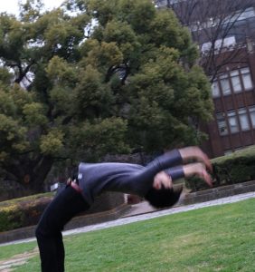 運動会体操部に所属して、体操をやってます。去年は主将をやってました。