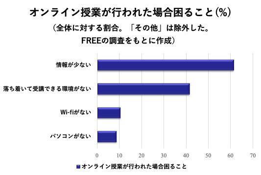 FREEの調査によると、「オンライン授業が行われた場合困ること」の設問に、Wi-fiやパソコンがないといった、ネット環境の不安を挙げた人がそれぞれ1割程度いました。