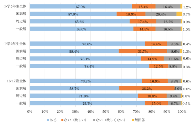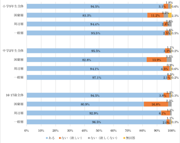 先ほど挙げた東京都の「子供の生活実態調査」によれば、家庭用学習教材の活用度や、勉強する場所の有無にも、困窮層とそうでない層で有意差があることがわかっています。