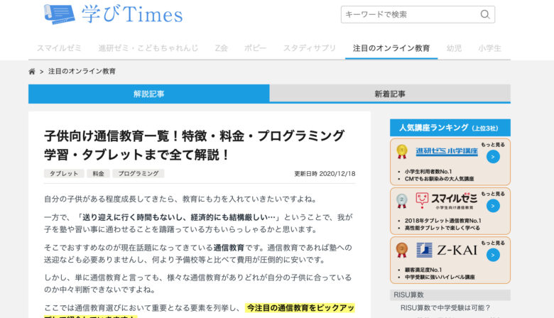 学びTimesの方でも、例えば今大変注目を集めているタブレット教材に「スマイルゼミ」というものがありますが、このサービスの評判を知りたい方に対して、「実際にスマイルゼミを購入・利用した生のレビュー記事」を作成することで、ユーザーが本当に知りたい情報を提供しています。
