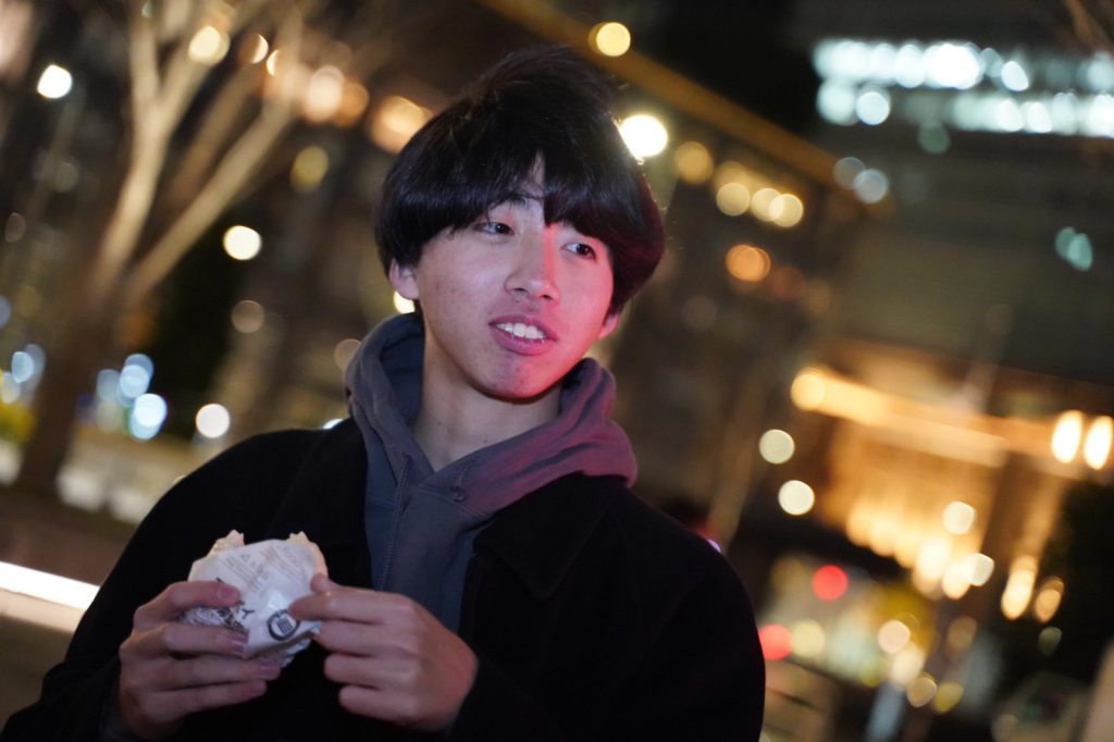 バイト先からそのまま筆者に連れてこられたれおんは肉まんとファミチキを頬張って大会に備えます。徹夜明けのため、今日はこれが1食目だそうです。