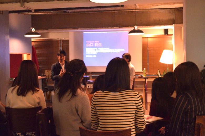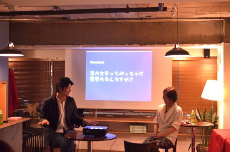 男子率8割の東京大学の女子が30人近く集まり、東大OGの皆川恵美さんと初代ミスター東大の山口幹生さんと恋愛について語るという、biscUiT主催のイベントです。