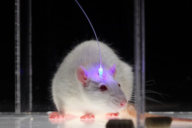 まず、この実験では動物の脳内の注目する神経に光を当てると、ON/OFFが切り替わるような細工を施します。神経のON/OFFというのは、電気信号が流れたり流れなくなったりするイメージです。
