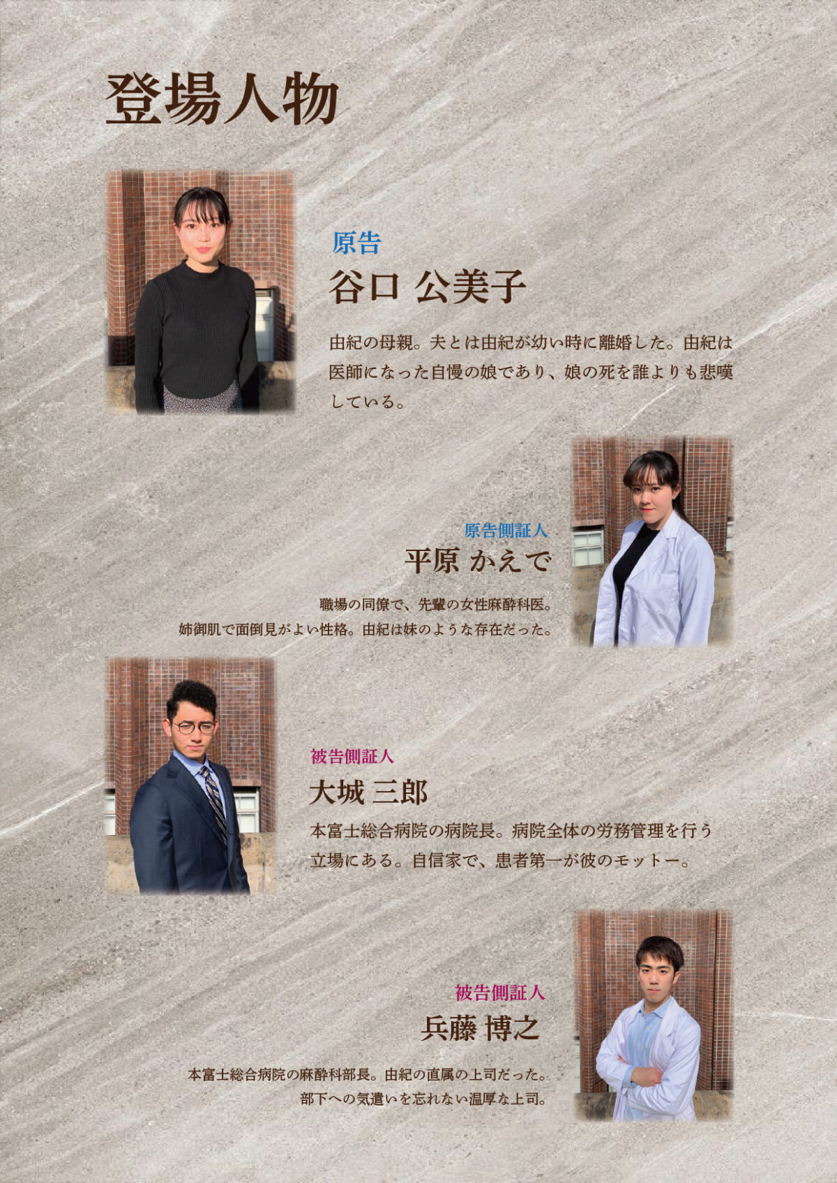 また、本年度の模擬裁判では、 病院側、家族側の証言から、過労死したとされる医師の様々な一面が解き明かされていきます。医師を「死」に追い詰めたものは何であったのか、演者すら結末を知らない結末に向かい、リアルタイムで躍動する法廷劇をお楽しみください。